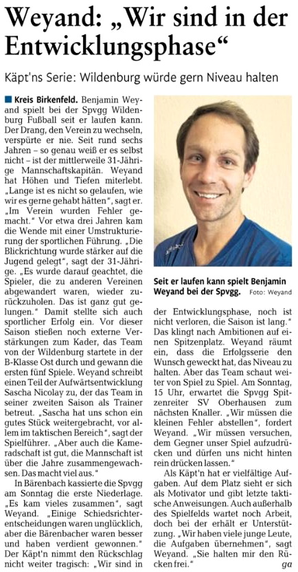 Im Rahmen der Käpt’ns Serie der Nahe-Zeitung wurde auch der Spielführer der Sportvereinigung Wildenburg interviewt. Er hat hier den Verein hervorragend präsentiert. Lesen Sie hier. (ul)