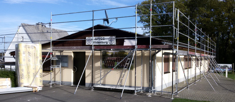 Das Sportlerheim in Schauren wurde rundum „eingerüstet“. Das ist ein deutliches Zeichen, dass die Dachdeckerfirma Burkard aus Bernkastel-Wehlen mit den Arbeiten am Dach beginnt. Wenn das Wetter mitspielt, soll die Dachsanierung innerhalb einer Woche abgeschlossen werden. (ul)